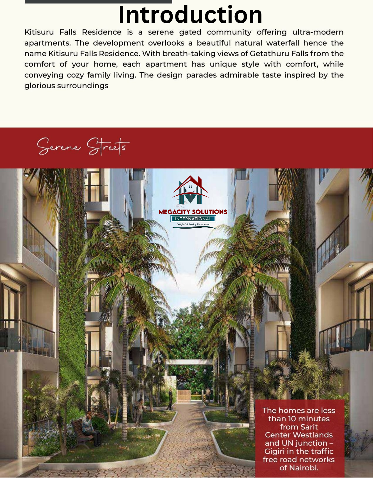 Kitisuru Falls Residence Kitisuru Falls Residence is a serene gated community offering 1, 2 & 3-bedroom ultra-modern apartments. The development overlooks a beautiful natural waterfall hence the name Kitisuru Falls residence. With breathtaking views of the Getathuru Falls from the comfort of your home, each apartment unifies style with comfort while conveying cozy family living. The design parades admirable taste inspired by its glorious surroundings. The development is located in Kibichiku near New Kitusuru and Kitisuru Spring estates along Getathuru Road off Ngecha Road. The homes are less than 10 minutes from Sarit Center Westland and UN junction – Gigiri in the traffic-free road networks of Nairobi. In the neighbourhood we have: UNEP headquarters and US Embassy Sarit Centre Wetlands Nairobi Village Market Shopping mall Two Rivers Shopping Mall International School of Kenya School of all nations Kirawa Primary School Jalyn Kindergarten & Day care Muthaiga Golf Club Tribe Hotel, Village Market Among others facilities and institutions
